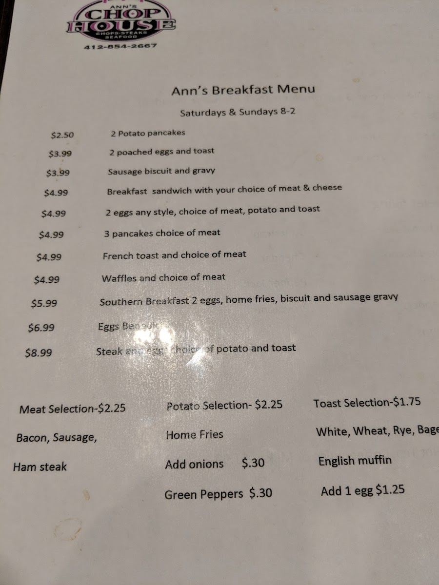 Located in Bethel Park, PA, Ann's Chop House is a culinary gem that offers a delightful menu focused on steaks and chops. Signature dishes include the tender T-bone and hearty New York strip steaks, which epitomize flavor and juiciness at enticing prices. The grilled pork chops are another crowd-pleaser, prepared to perfection.
